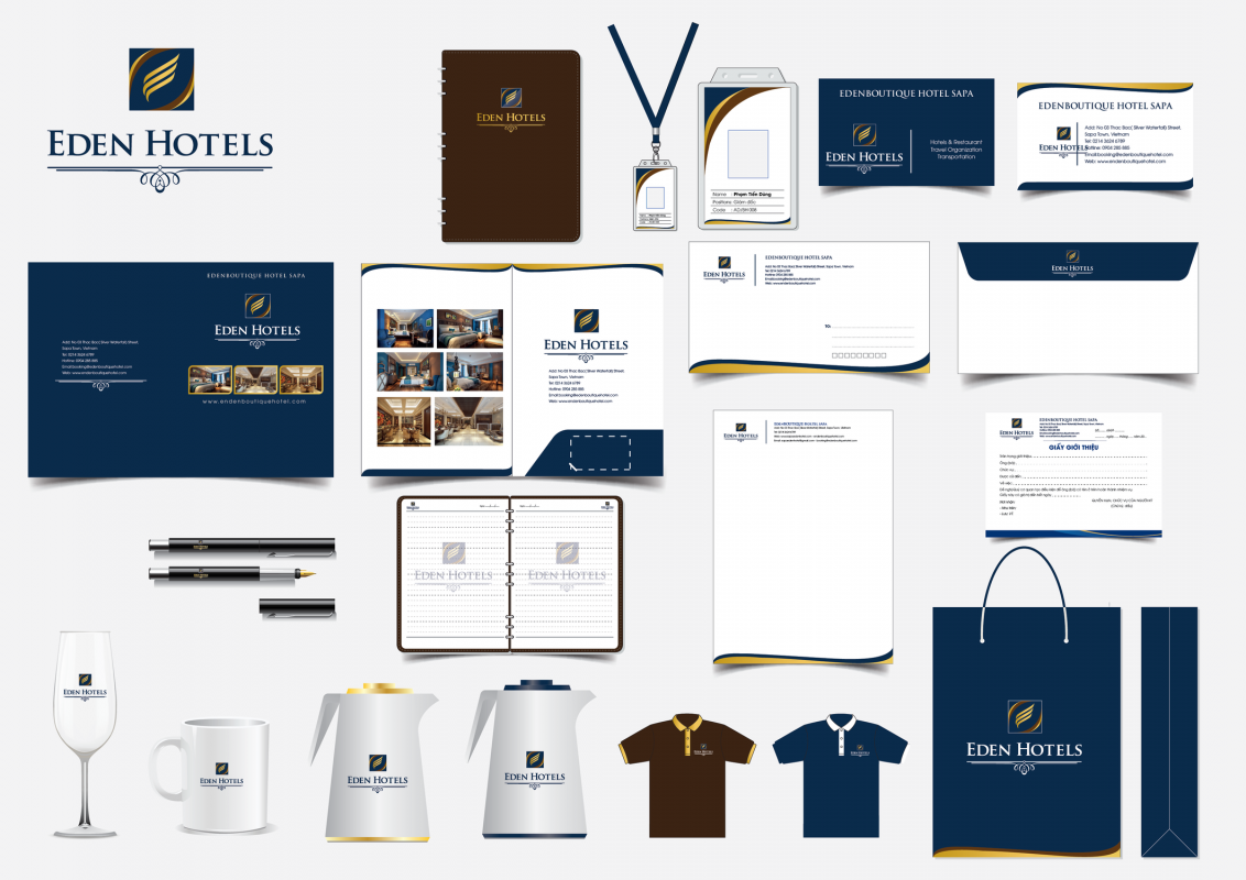 Bộ nhận diện thương hiệu văn phòng gồm: Danh thiếp (name card), Tiêu đề thư, Phong bì thư (A4, A5, A6), Hóa đơn, Thẻ nhân viên, Đồng phục nhân viên, Túi giấy, Kẹp file, Bìa sổ tay, Bìa sổ da.