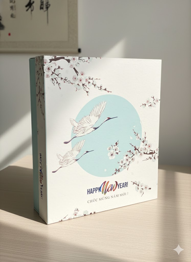 Nếu doanh nghiệp bạn hướng tới sự sang trọng, tinh tế, mẫu thiết kế "Hạc Vũ Xuân" là gợi ý không thể bỏ qua. Trên nền giấy trắng ngà cao cấp, hình ảnh chim hạc tung cánh bên cành đào tượng trưng cho sự trường thọ, thanh cao và khởi đầu mới đầy hy vọng. Mẫu hộp này rất phù hợp cho các sản phẩm yến sào, sâm, hoặc quà tặng sức khỏe cao cấp.